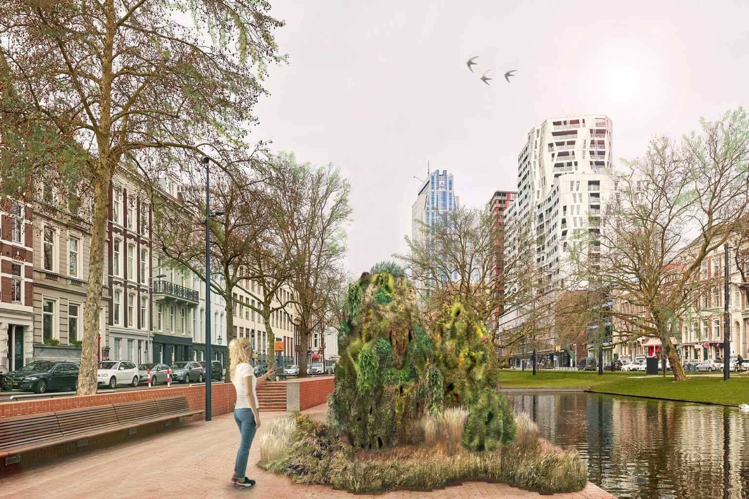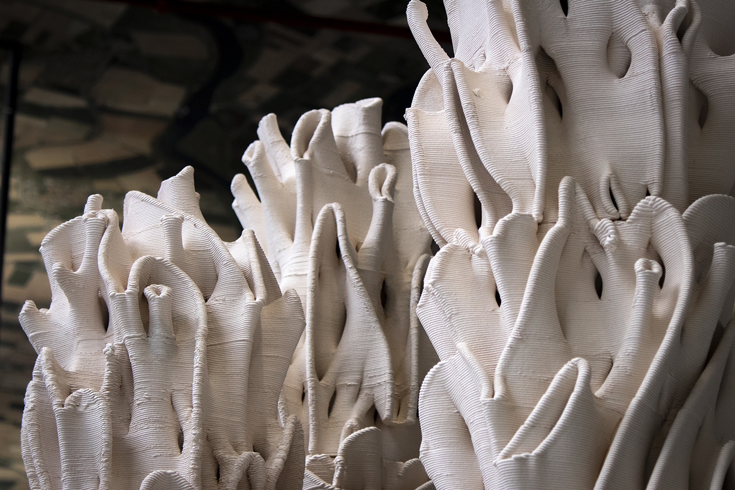 Urban Reef ziet de stad als een levend landschap, een rif. Een bio-inclusieve stad biedt niet alleen onderkomen voor de mens, maar voor allerlei soorten leven. Maar vaak wordt er geen rekening gehouden met niet-menselijke belangen: stedelijke gebieden veranderen in biodiversiteitswoestijnen en hitte-eilanden. Poreuze ruimtes en microklimaten ondersteunen stedelijke ecologie en verminderen klimaatproblemen. De door algoritmen gegenereerde, 3D-geprinte ‘Reefs’ bieden variaties in vochtigheid, porositeit, materialen en oriëntatie op zon, wind en regen. De sculpturen absorberen water en warmte en werken als stedelijke ecologische stapstenen. In het komende prototype meten IoT-sensoren klimaatschommelingen, terwijl een speelse ‘Tamagotchi’ de data visualiseert voor voorbijgangers.