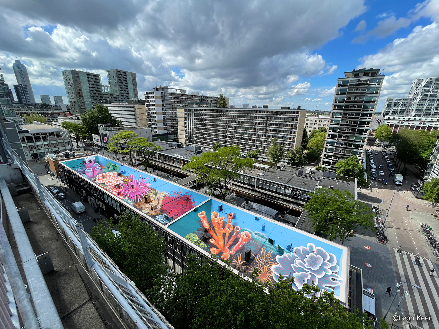 De lijnbaan is een nationaal monument en ontworpen als een voetgangersvallei in de stad. Deze vallei bestaat nu echter uit gebouwen met grijze daken met veel klimaatkasten erop. Zou het niet prachtig zijn om een groene vallei te creëren in het centrum van de stad? Kunstenaar Leon Keer maakte op ons verzoek een verbeelding van een meer levendige Lijnbaan. De verf voor dit project werd gesponsord door het Rotterdamse Simonis Verf.