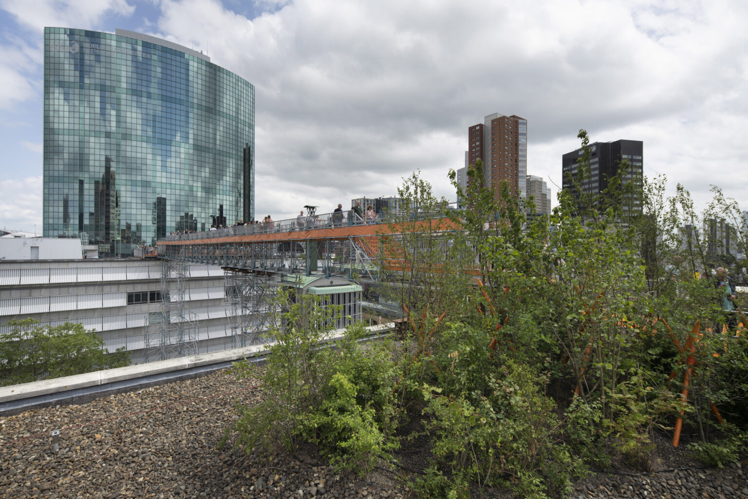 Het dak van de Bijenkorf waar je nu op staat is normaal een grinddak. LOLA Landscape Architects heeft in het ontwerp voor het groen op dit dak laten zien hoe de natuur zich langzaam een weg baant door het grind, en permanent een plek op het dak verovert. Want dat willen we natuurlijk het liefst: permanente vergroening. Het groen is ter beschikking gesteld door Boomkwekerij Ebben en De Stadskwekerij van de gemeente Rotterdam. Het is aangelegd door Donkergroen.