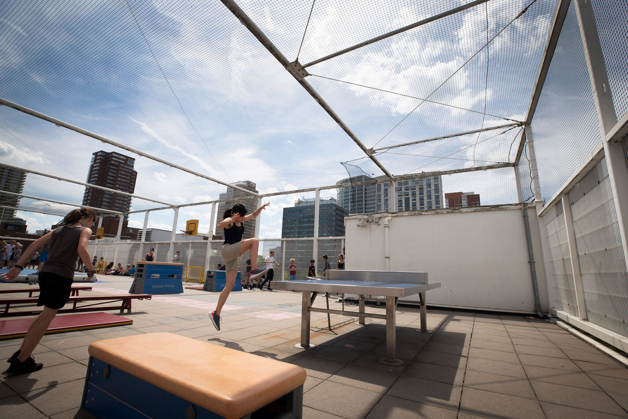 Vanaf hier zie je in de verte – nog vóór de Markthal – de Jan Prins en Willibrordusschool, waar kinderen op het dak spelen. En bij de ingang van de Rooftop Walk kwam je langs een voormalige kinderopvang met speelplaats op het dak van WTC Rotterdam. In drukke steden, waar kinderen niet zomaar op straat kunnen spelen, is het dak een hele handige en veilige uitvalsplek.